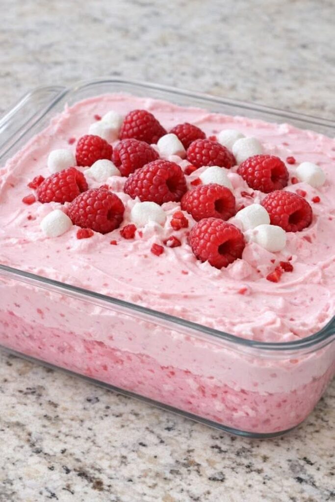 Incorporate the Fruit: Before the gelatin fully sets, stir in the frozen raspberries. The coldness of the berries will help thicken the gelatin quickly. - The “Fluff” Factor: Gently fold in the thawed whipped topping. For a solid pink look, mix thoroughly. For the “fancy” layered look shown in the image, fold half the whipped topping into the gelatin base and spread it into your dish, then top with a lighter layer of whipped topping mixed with just a hint of the raspberry mixture.