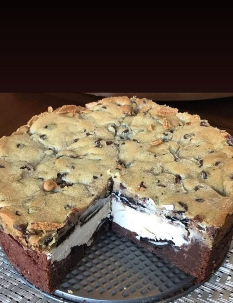 Arrange another layer of cookies on top of the cheesecake layer, then place the frozen cookie dough disk on top.