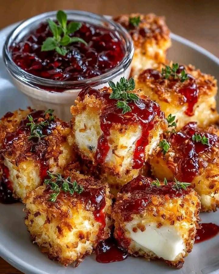 Place coated Brie bites on the prepared baking sheet and bake for 10–12 minutes, or until golden and slightly melted inside