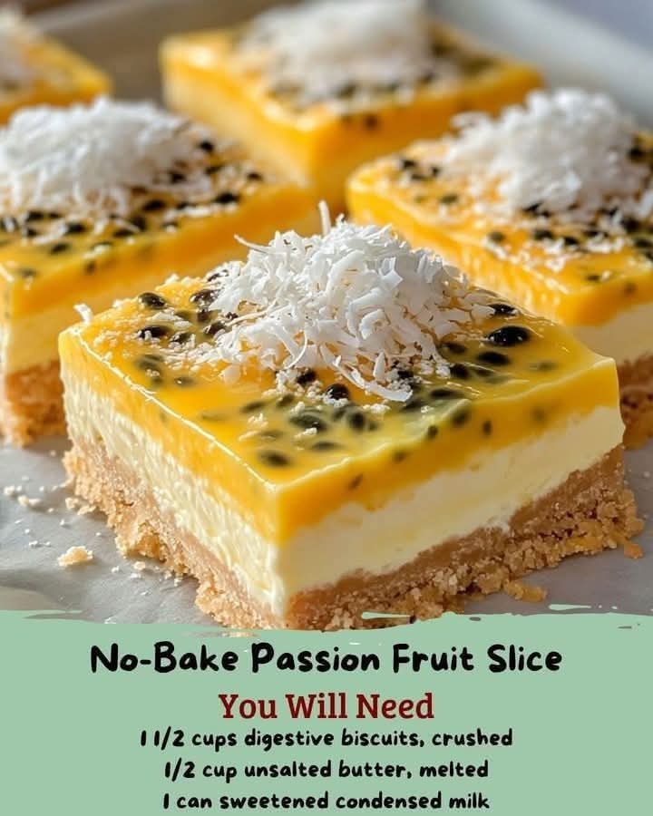 No-Bake Passion Fruit Slice 🍋🥥 A refreshing and creamy slice with a buttery biscuit base and a luscious passion fruit topping! Ingredients For the Biscuit Base: 1 ½ cups crushed digestive biscuits ½ cup unsalted butter, melted For the Creamy…