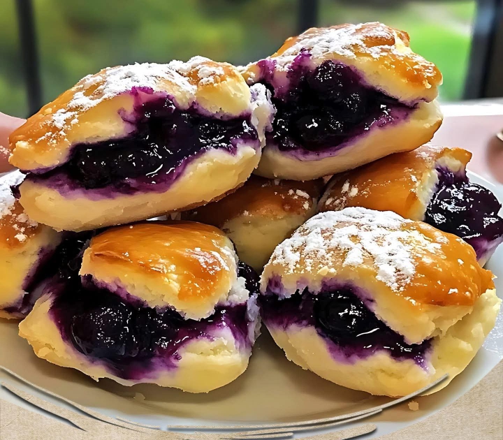 Blueberry Pie Bombs Ingredients: 1 can (16.3 oz) refrigerated biscuit dough (8-count) 1 cup blueberry pie filling 4 oz cream cheese, softened 2 tbsp powdered sugar 1 tsp vanilla extract ¼ cup unsalted butter, melted ⅓ cup granulated sugar 1…