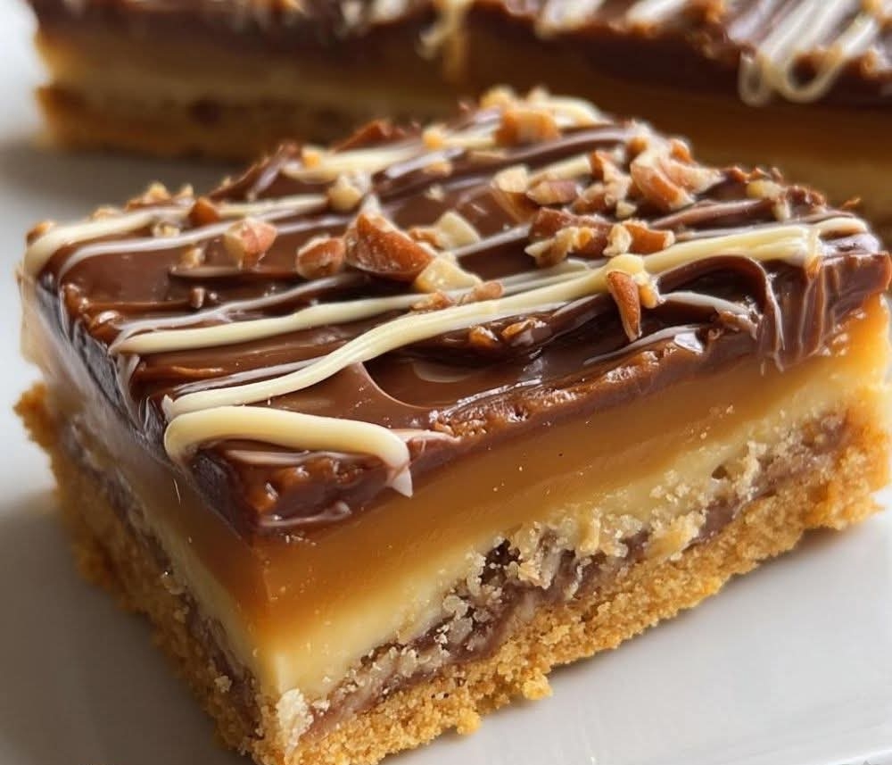 - Pour the caramel mixture evenly over the graham cracker crust.