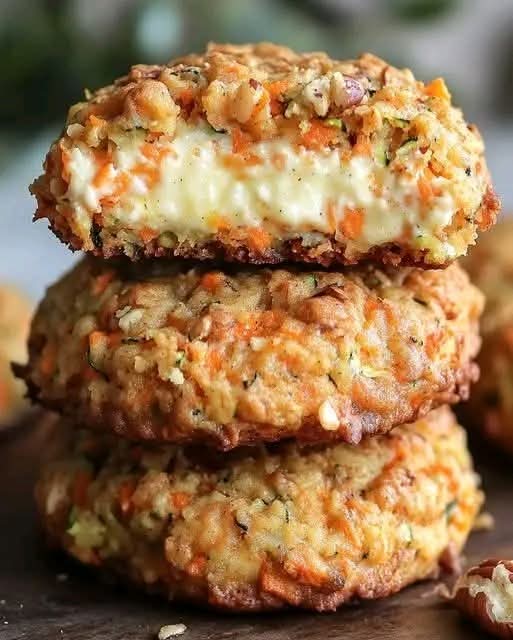 Scoop a tablespoon of cookie dough and flatten it slightly in your hand Place a small dollop of cream cheese filling in the center Take another small scoop of dough and flatten it placing it on top of the cream cheese Seal the edges gently to enclose the filling