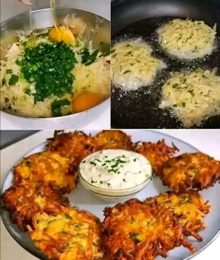 Potato fritters😋😋 Ingredients 2 large potatoes 500g Parsley Spring onions Salt, pepper, garlic powder 2 medium eggs Corn starch 2 large tablespoons (40g) Sweet paprika Coriander 7g Vegetable oil for frying For the sauce: Natural yogurt 120g 1 lemon (half…