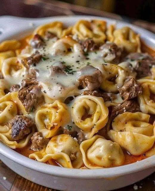 Enjoy your delicious meal that merges the hearty flavors of a cheesesteak with the comforting texture of tortellini!