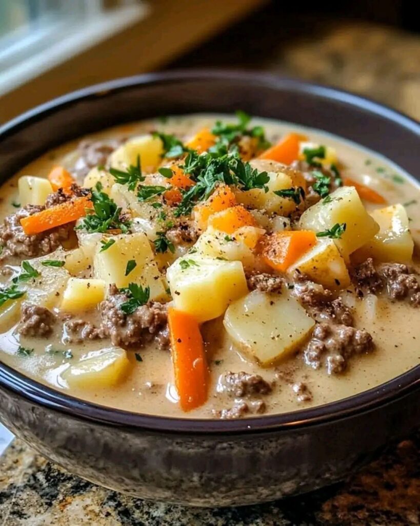 This Crockpot Creamy Potato & Hamburger Soup is warm, filling, and easy to make, perfect for cozy nights! 🍲