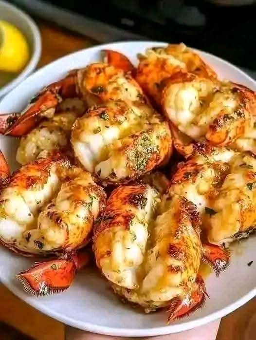 “Juicy lobster tails drizzled with a luscious garlic butter sauce, perfectly baked for a truly indulgent meal.”