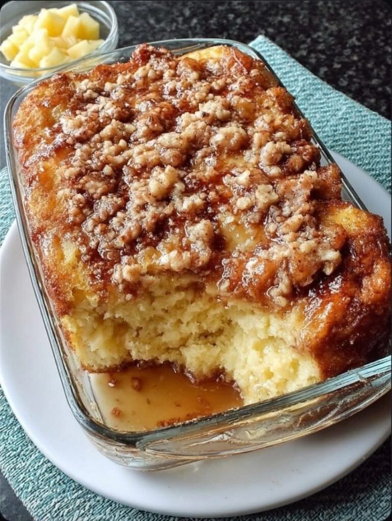 Sprinkle the topping over the bake: Evenly distribute the crumbly topping over the prepared French toast bake in the baking dish. This will create a sweet, crunchy layer on top once baked.