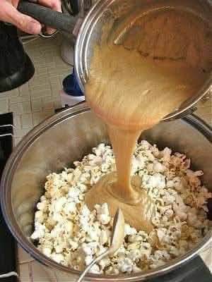 Carefully drizzle the hot caramel over the popcorn. Use a spatula to toss and coat each piece evenly. Work quickly before the caramel hardens.