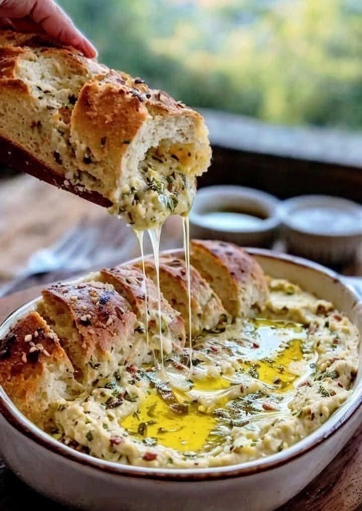 - Serve the olive oil dip with sliced French baguette for dipping.