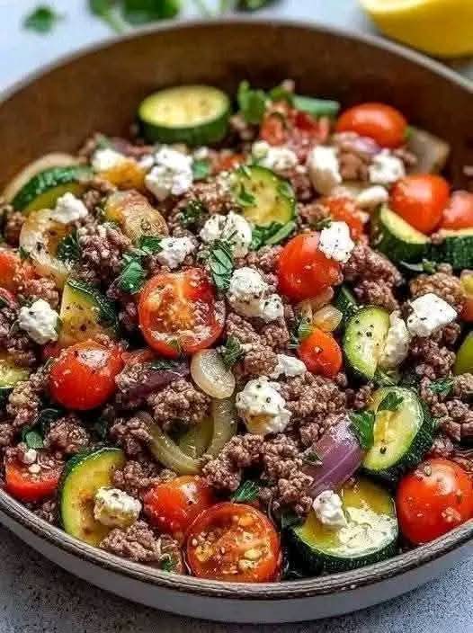 Push the beef to one side of the pan. Add another tbsp of olive oil, then add the onions and garlic. Sauté for 2–3 minutes until fragrant. Add zucchini slices and cook until slightly tender. - Add tomatoes:
