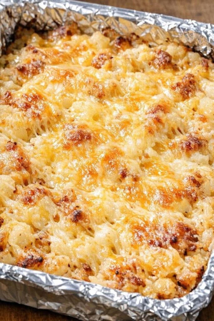 Serve this casserole hot, straight from the foil-lined pan, with simple proteins like roasted or grilled chicken, ham, or meatloaf. A crisp green salad or steamed green beans helps balance the richness, and it’s also great alongside scrambled eggs and bacon for a cozy breakfast-for-dinner situation. Leftovers reheat well, so I like to pair them with a fried egg on top the next morning for an easy, indulgent brunch.
