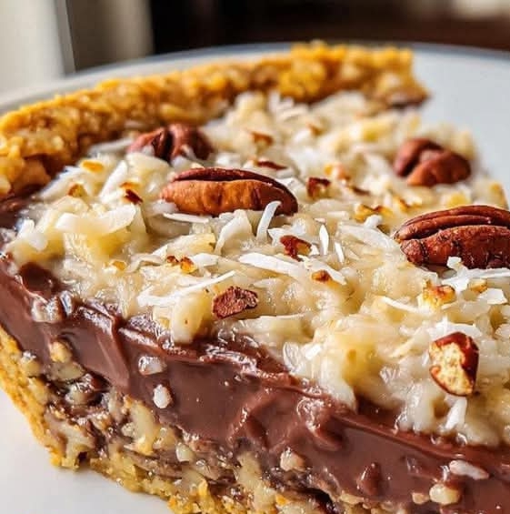 Spoon the cooled German chocolate topping over the chilled chocolate layer.