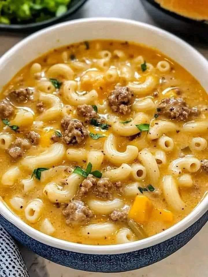 This soup is rich and creamy with tender macaroni, savory beef, and a cheesy base that tastes just like a cheeseburger without the bun. Every spoonful is comforting, filling, and packed with familiar flavors