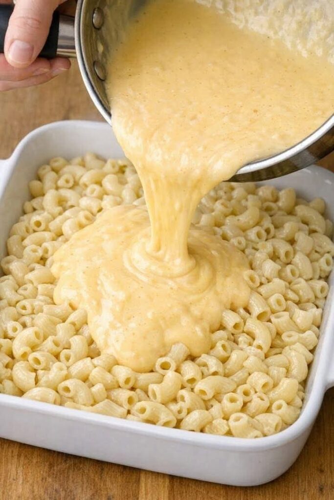 Slowly pour the warm, silky cheese sauce over the pasta in the baking dish. Make sure you cover all the nooks and crannies. Use a spoon or spatula to gently stir and fold the macaroni so every piece is coated in sauce.Cheese