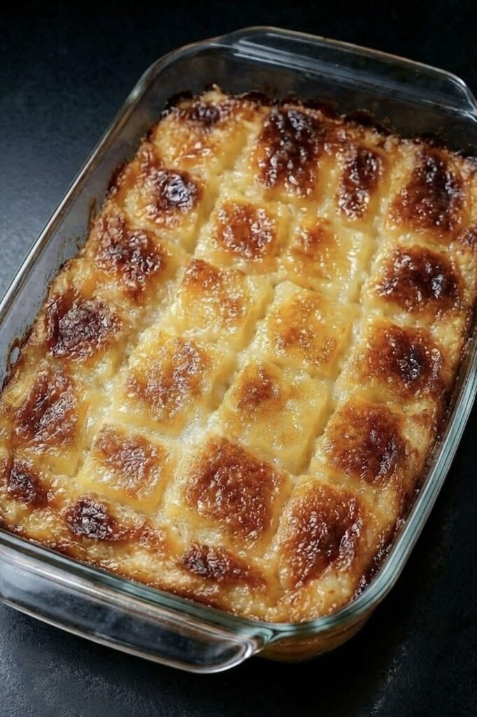 Think of it as a cross between bread pudding and pineapple cobbler: golden edges, a custardy center, and juicy pineapple that makes you reach for just one more spoonful.