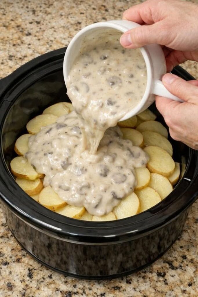 Slowly pour the cream of mushroom mixture evenly over the top of the layered potatoes and ham, making sure to cover as much of the surface as possible. Gently tap the slow cooker on the counter or use the back of a spoon to nudge the top layer so the sauce settles down between the slices.