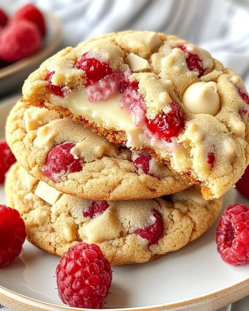 The contrast of flavors and textures makes these cookies an irresistible treat. Perfect for special occasions, holiday baking, or simply as an indulgent snack, these cookies bring together the best of both sweet and tart in every bite. The addition of white chocolate enhances the richness, while the raspberries add a refreshing burst of flavor, making this cookie a truly unique and satisfying dessert.