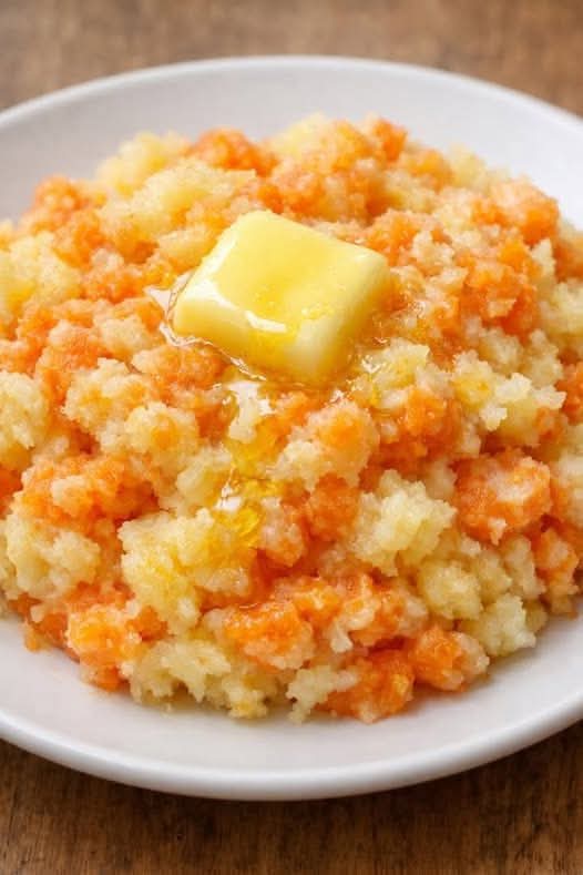 Spoon the carrot and potato mash onto a warm plate or into a shallow bowl. Top each serving with a small extra pat of butter so it melts and pools into the warm vegetables before serving.