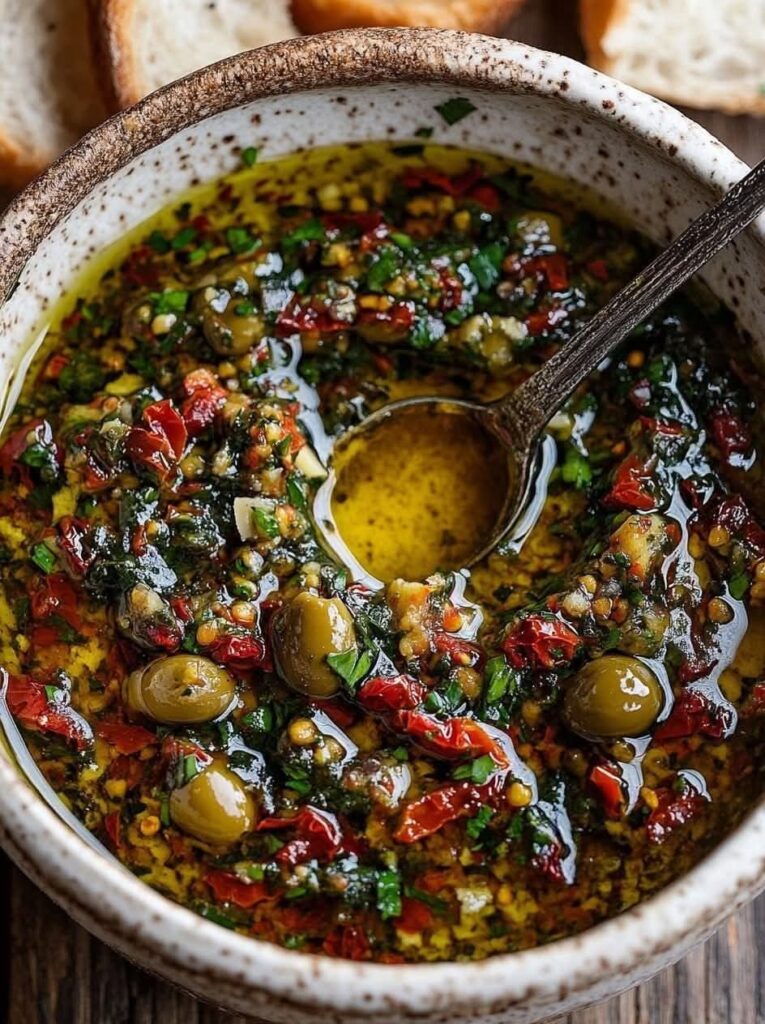 This Sun-Dried Tomato Olive Oil Bread Dip is a bold, herby, and flavorful appetizer that’s perfect for dipping warm, crusty bread. Packed with savory sun-dried tomatoes, briny olives, and aromatic herbs, this dip is a celebration of Mediterranean-inspired flavors. It’s quick to make, incredibly versatile, and guaranteed to be the star of your next gathering or cozy dinner at home.